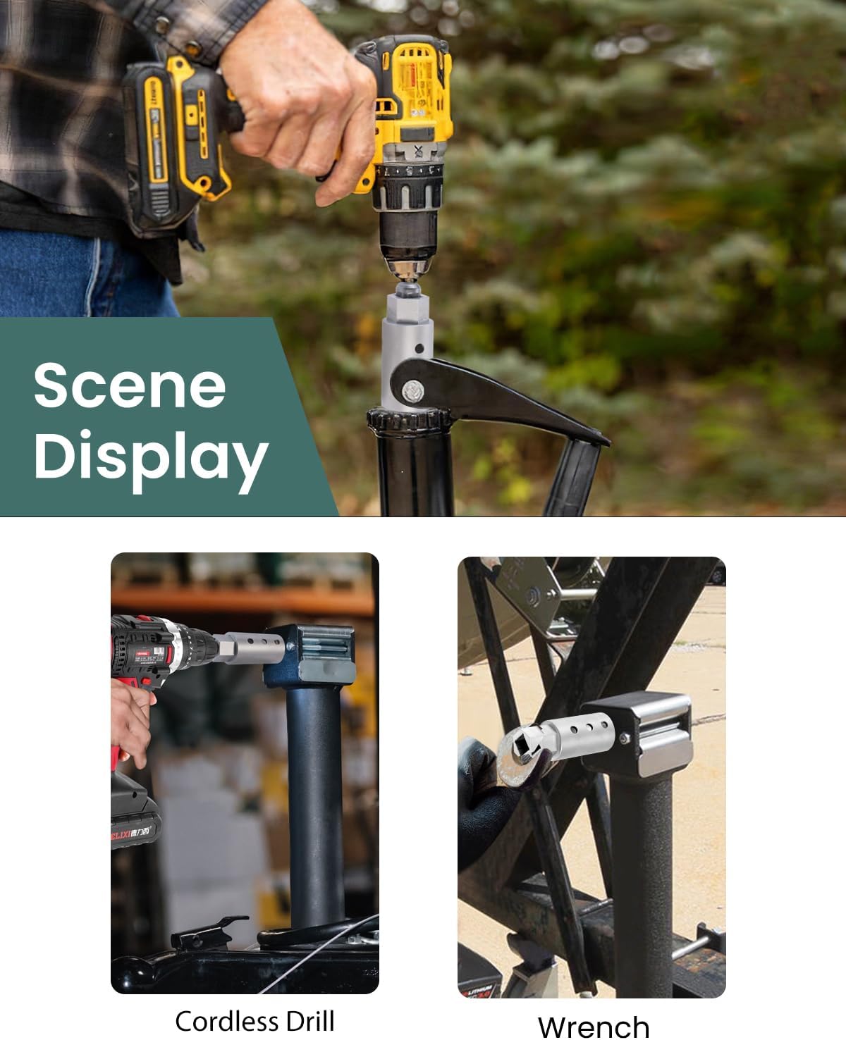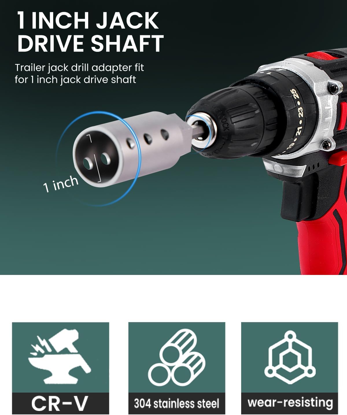 A Trailer Jack Drill Adapter enables a worker with arm or back impairment to effortlessly raise and lower his trailer. When hitching or unhitching a standard trailer, the worker must either lift the trailer hitch off the ball or manually crank a handle. The Trailer Jack Drill adapter can raise or lower a trailer rapidly when attached to the standard crank. Great for farmers, construction workers, groundskeepers, and anyone who needs to hitch a trailer.