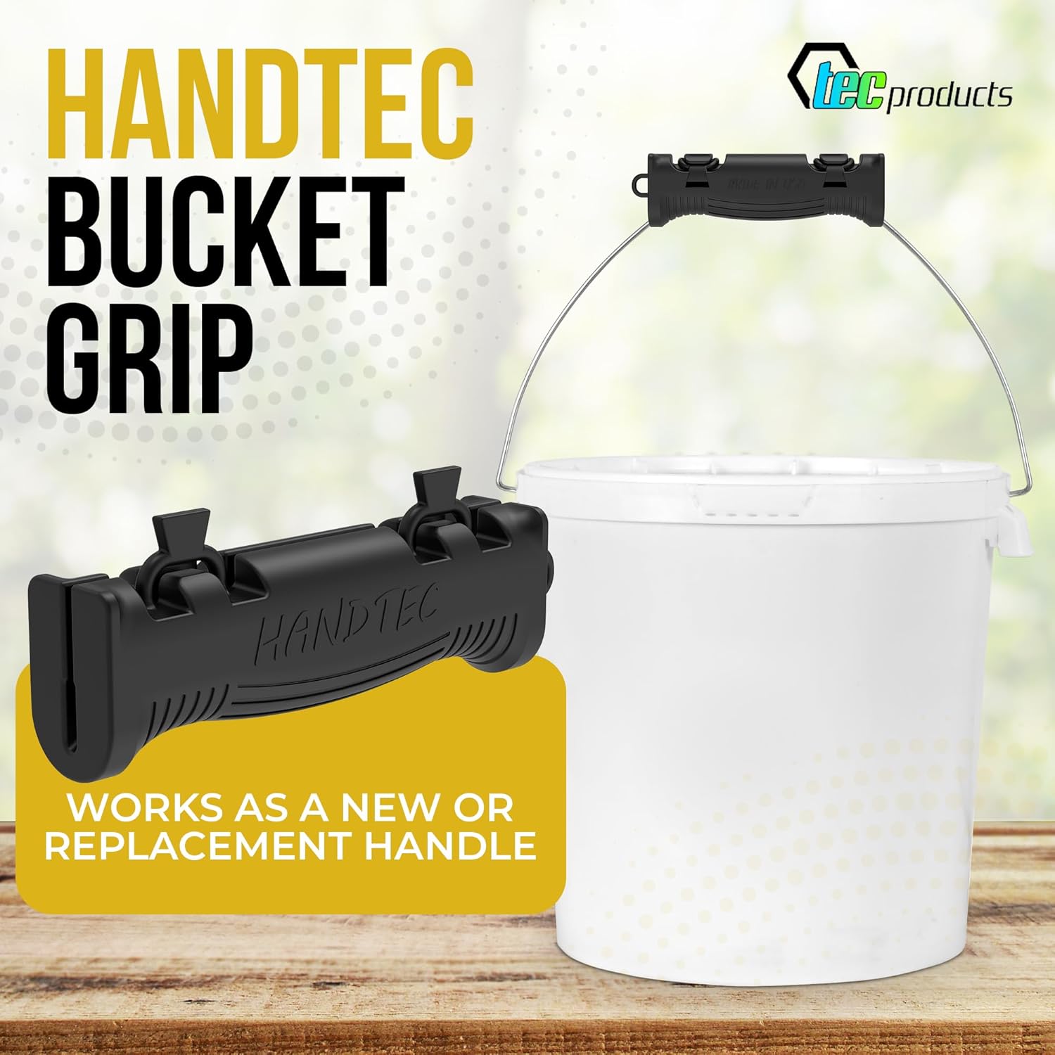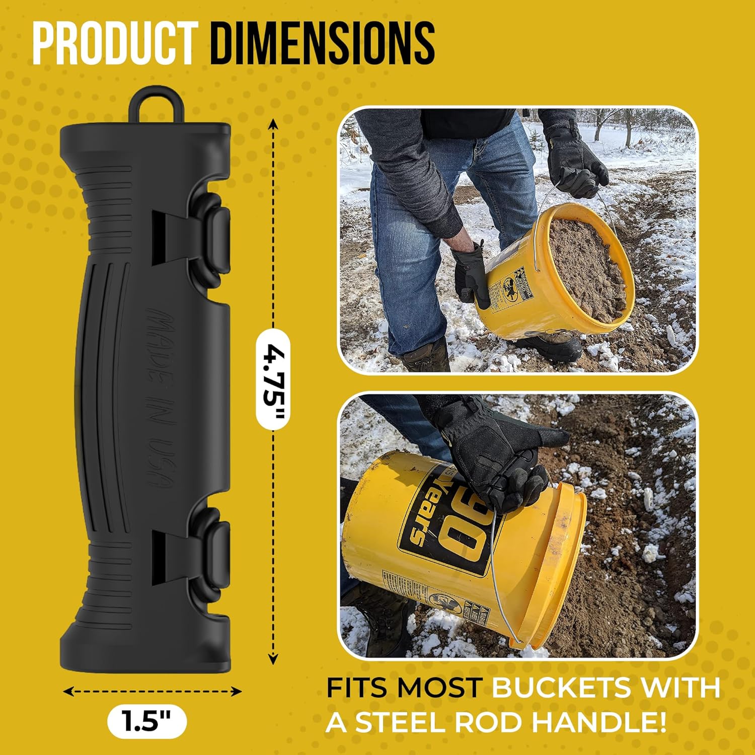 Standard 5 gallon bucket handles are either narrow steel or have plastic around them that are fairly small in diameter. Workers carrying buckets of grain or milk to calves must grasp and carry the handles.