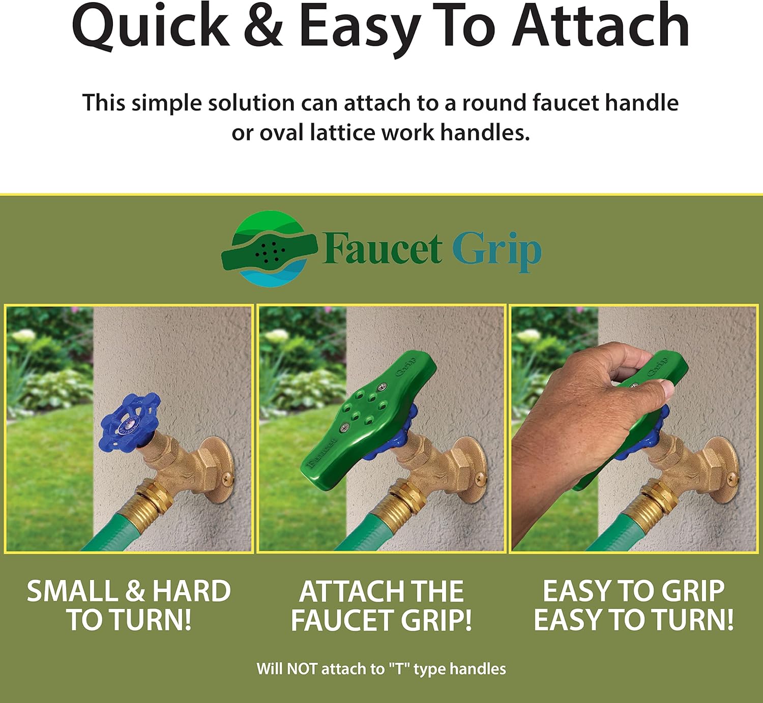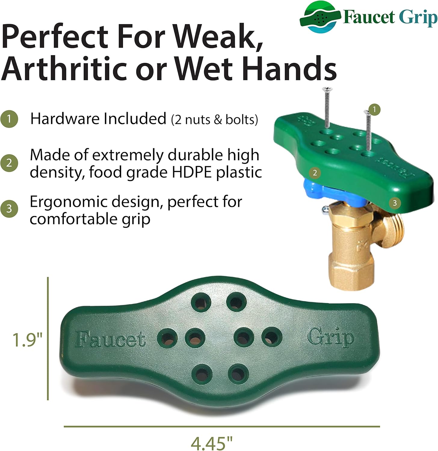 Workers with arthritis, paralysis secondary to stroke and nerve damage, finger injuries/damage and others all struggle with hand strength and gripping. Turning on and off standard round faucet handles can be difficult. Use of a Faucet Grip allows a worker to grasp and turn the faucet without having to grip a small round handle.