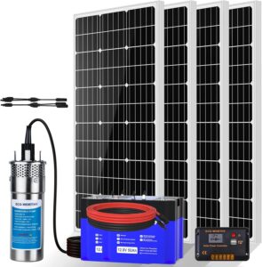 • [400W Solar Well Pump System]:Includes 400W solar panels + 120W submersible pump (3.2 GPM flow) + 2x50Ah LiFePO4 batteries + controller. Provides reliable water supply for farms, homes, or remote locations.