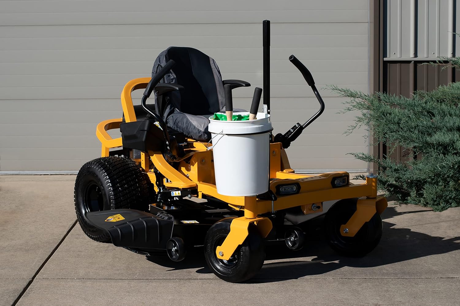 It has the added benefit of holding a five gallon bucket for tools or trash as you are mowing.