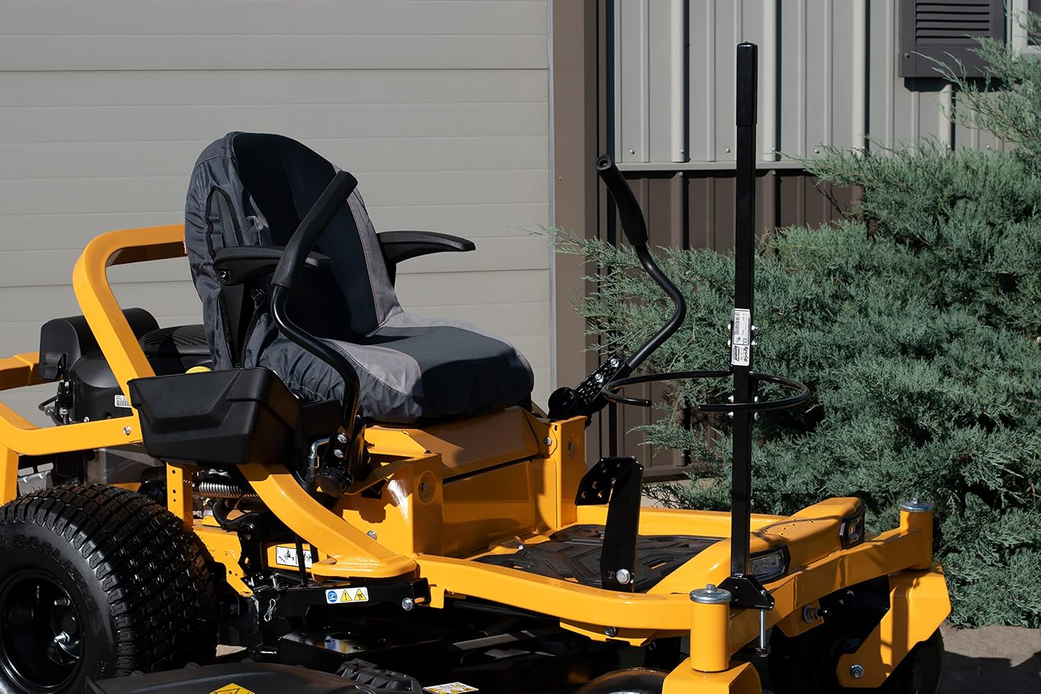 A Zero Turn Mower Handle/Bucket bracket gives a handle and bucket holder for a lawnmower helps workers with mobility impairments climb to the operator station with more stable footing. Mowing grass can be done for employment or personal home maintenance and is a good opportunity for workers with disabilities to get back to work outside. The ZTR Mower Handle/Bucket Bracket gives a stable grab bar to assist climbing.